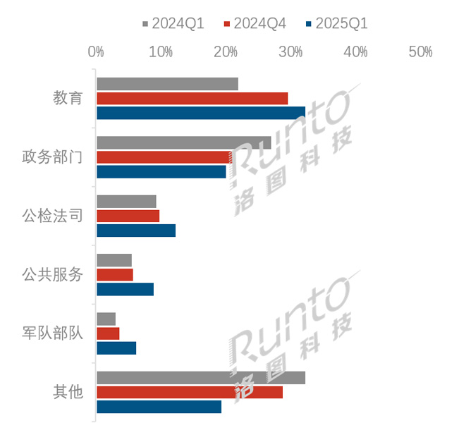 从应用的行业看,教育信息化催生了普惠型需求,政务采购步入强监管周期。根据洛图科技(RUNTO)数据显示,2025年第一季度,教育行业以32.4%的出货面积占比蝉联第一大应用行业,同比增长10.3个百分点以上,其中高职院校的渗透率突破55.9%,较K12阶段高出22.6个百分点。