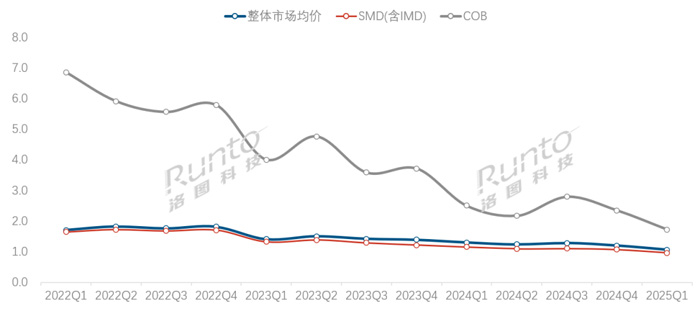 2022Q1-2025Q1 中国大陆小间距LED显示屏市场各技术产品均价走势